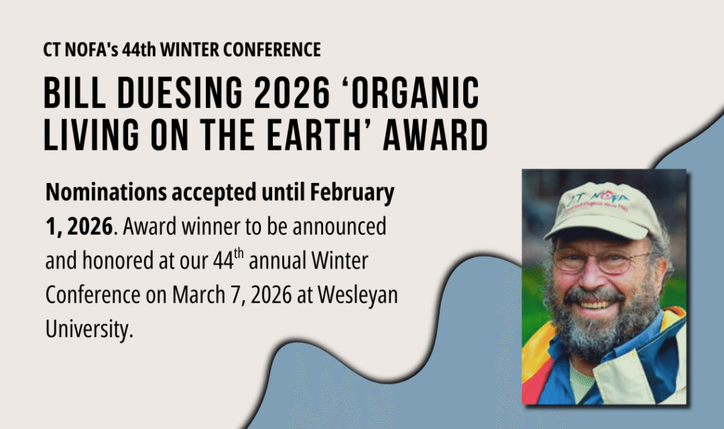 Each year, at our winter conference, CT NOFA confers the Bill Duesing Organic Living on the Earth award to a notable individual who or group which exemplifies the life mission of our founder, Bill Duesing, to improve and enrich our world through organic advocacy and practices.