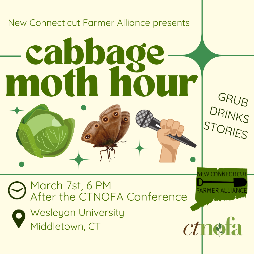 Join us after the conference for food, drink, and the New Connecticut Farmers Alliance’s famous Cabbage Moth Story Hour! Farmers are invited to take the stage and share a farm-related story: the time you had to chase your chickens across town, your craziest farm injury, your moment of agricultural inspiration, etc. Time limit is 8 minutes.